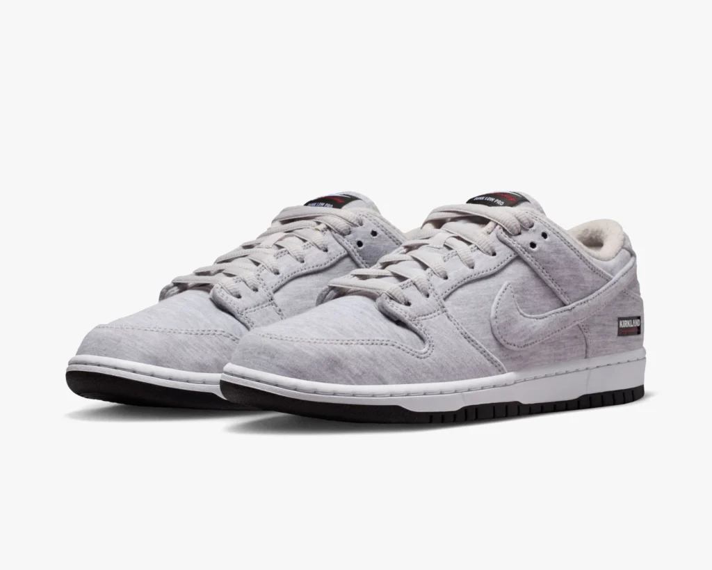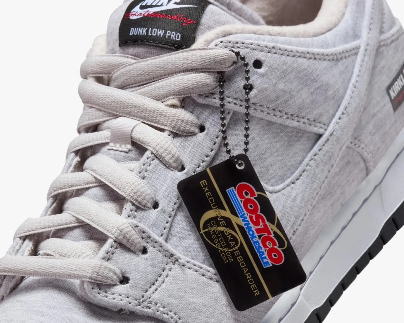Instead of the usual leather, Nike wrapped this Dunk in a heather gray material that looks straight out of your favorite warehouse hoodie. Inside? A fuzzy fleece lining that screams Saturday errands and free sample runs. You’ll even find Kirkland’s iconic script stitched on the heel tab and tongue — a loud and proud flex for the dad who organizes his garage with labeled bins.