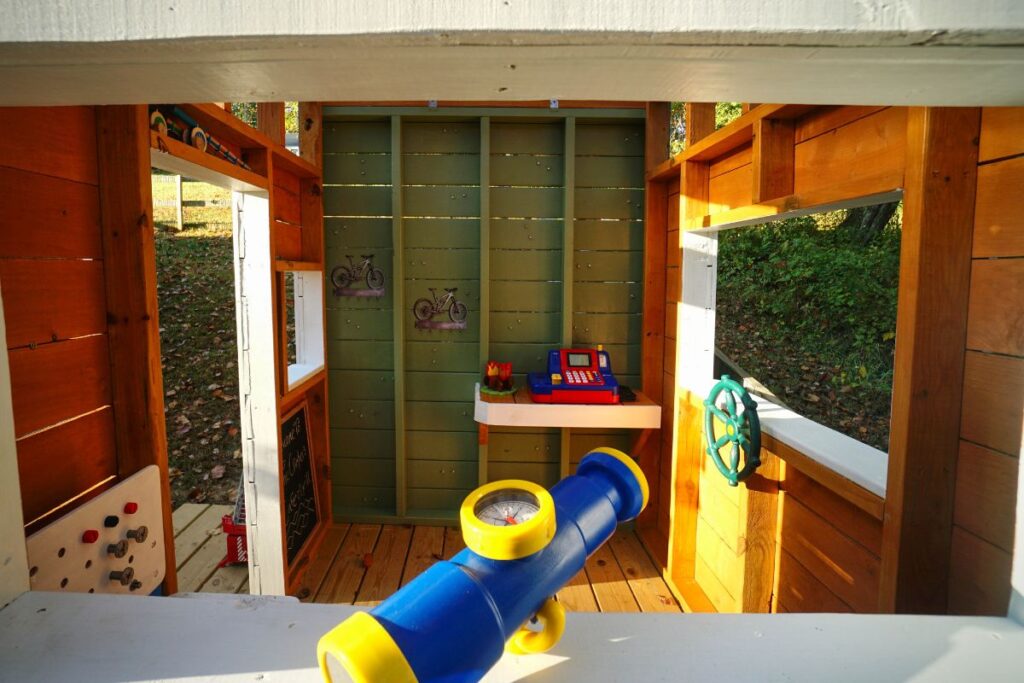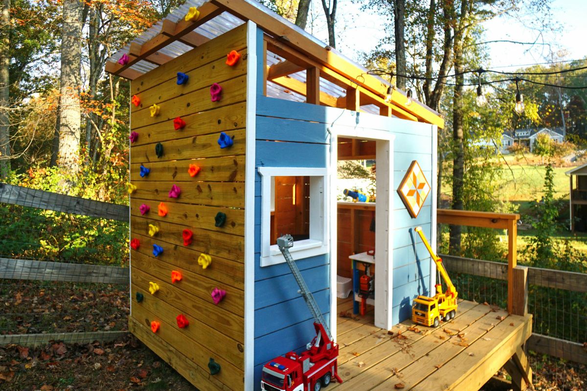 We knew we wanted a shed roof and lots of light, so we used clear roofing panels. We added a climbing wall, a captain’s wheel, a telescope, and a small countertop to invite creative play. Big windows look out into the woods, with clerestory windows above to bring in even more light—though not much help with the mosquitoes.